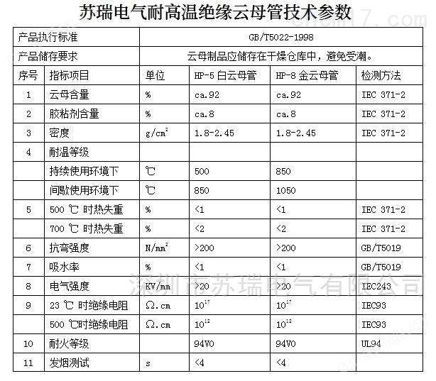 云母管的技术参数: