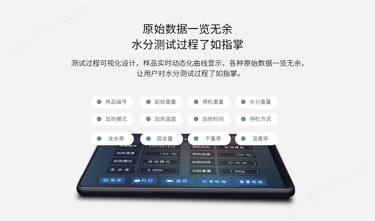 | 显示参数 | 水分值MC%、固含量DC%、干重比AM%、湿重比AD%、样品总重、样品干重、温度、时间等 |