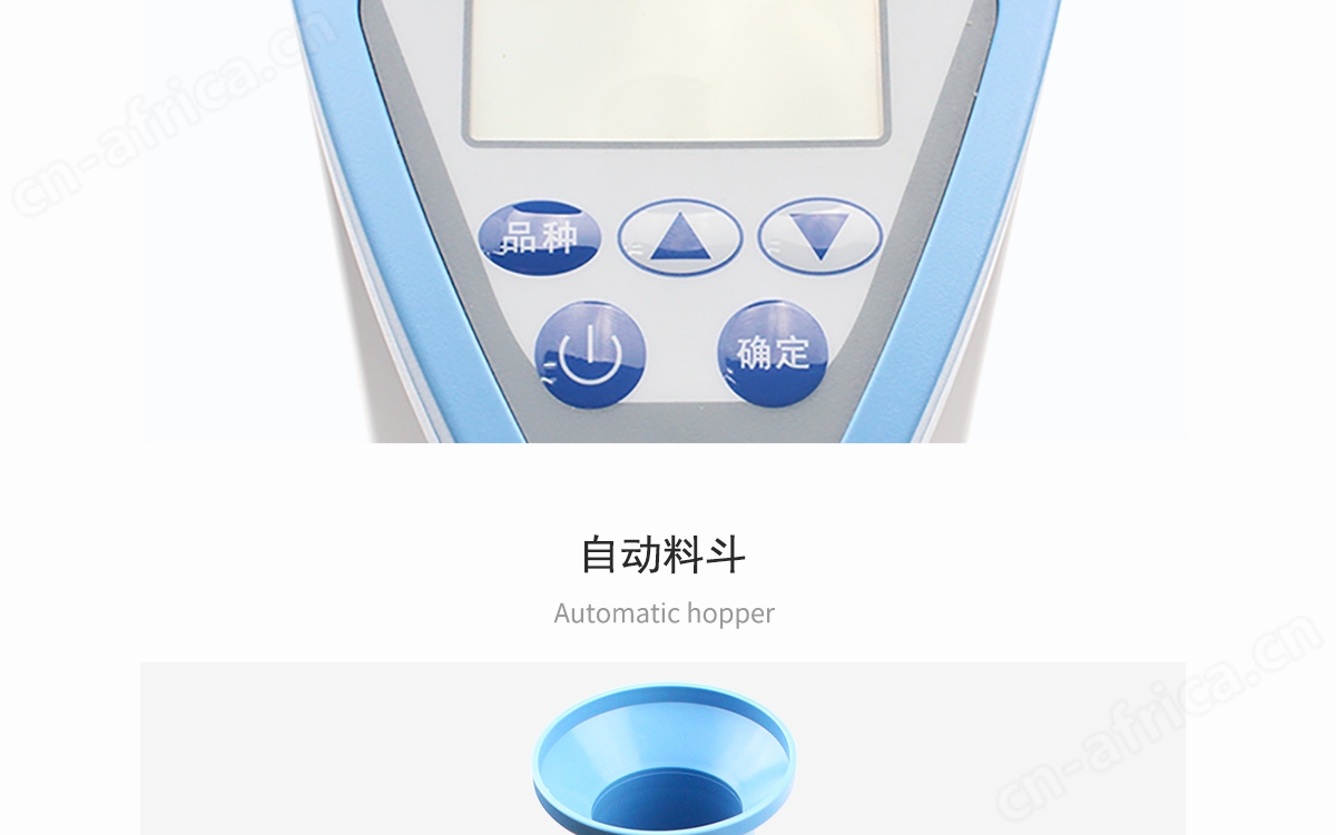 | 附属品 | 自动料斗、料斗基座、样品杯、刷子、定标砝码、电池1.5V(5#碱性电池)×4、使用说明书、产品合格证 |
